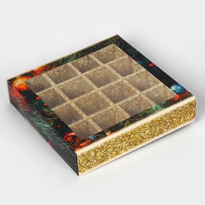 Коробка под 16 конфет "Новогодняя" размером 17,7х17,7х3,8 см - это прекрасный выбор для упаковки сладостей к празднику. Она выполнена в ярких новогодних цветах, что создает атмосферу праздника и волшебства.