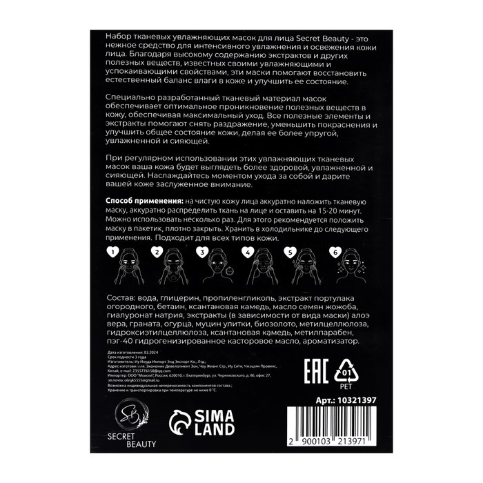 Набор увлажняющих, тканевых масок для лица «SB Beauty», 10 шт