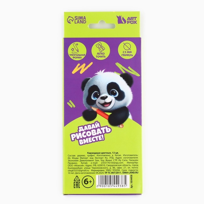 Цветные карандаши, 12 цв трехгранные ArtFox «Панда»