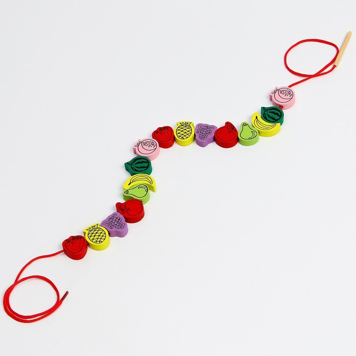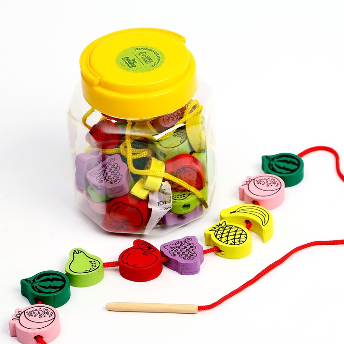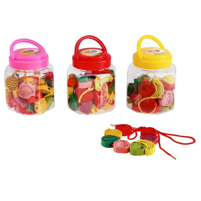 Шнуровка в банке 40 деталей "Фрукты", 2 иглы дерев , 2 шнурка, цвета МИКС