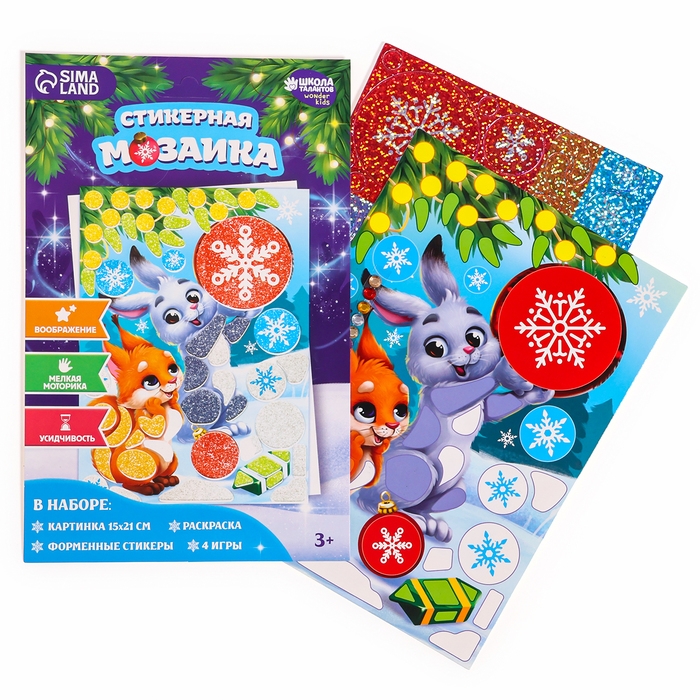 Помогите малышу собрать яркую мозаику: присоединяйте переливающиеся объёмные элементы к картинке-основе в нужном порядке. Самоклеящиеся стикеры выполнены из мягкого блестящего материала, который и создаёт неповторимый эффект.