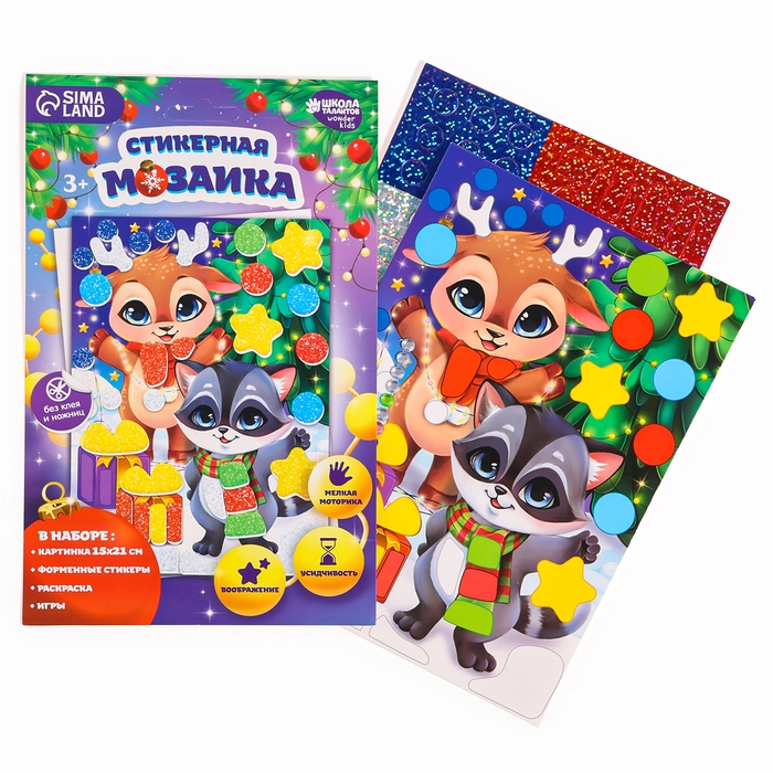 Помогите малышу собрать яркую мозаику: присоединяйте переливающиеся объёмные элементы к картинке-основе в нужном порядке. Самоклеящиеся стикеры выполнены из мягкого блестящего материала, который и создаёт неповторимый эффект.