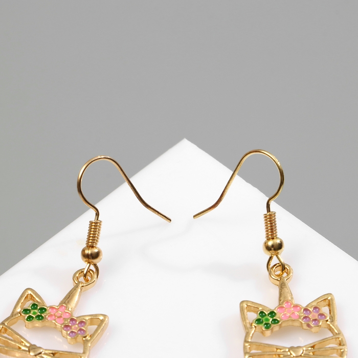Серьги эмаль «Кошка» с листьями, цветные в золоте