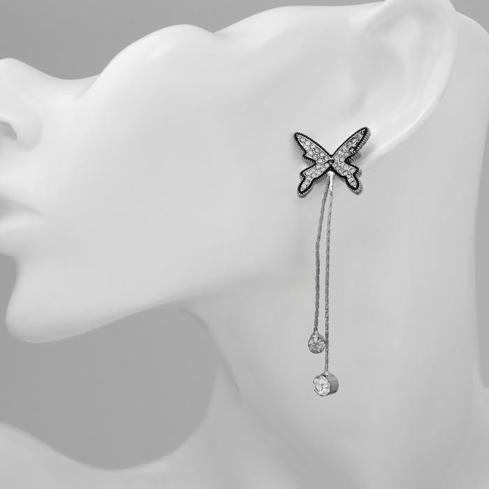 Серьги висячие со стразами «Бабочка» дуэт, цвет чёрно-белый в серебре