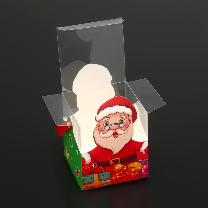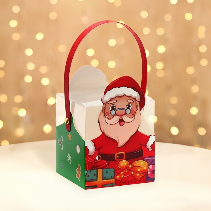 Новый год. Коробка подарочная новогодняя складная ПВХ с ручками, "Санта и Рудольф", 9 х 9 х 9,5 см.