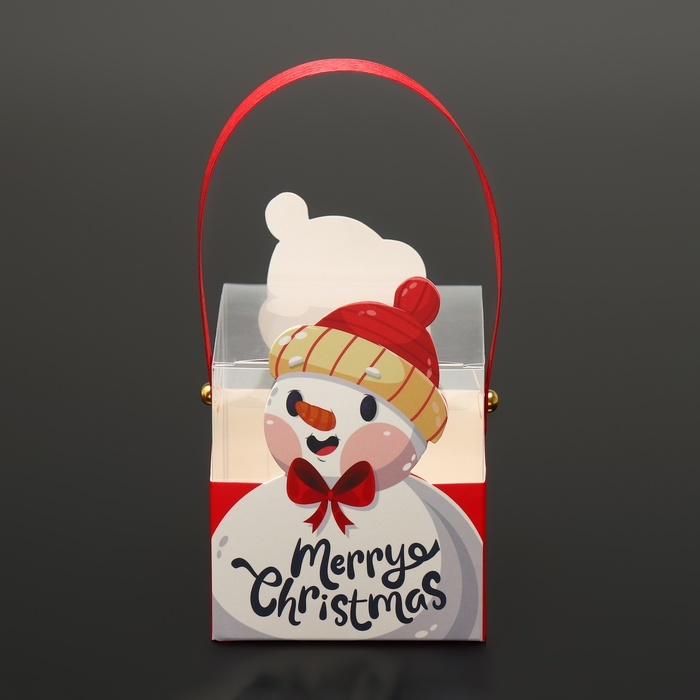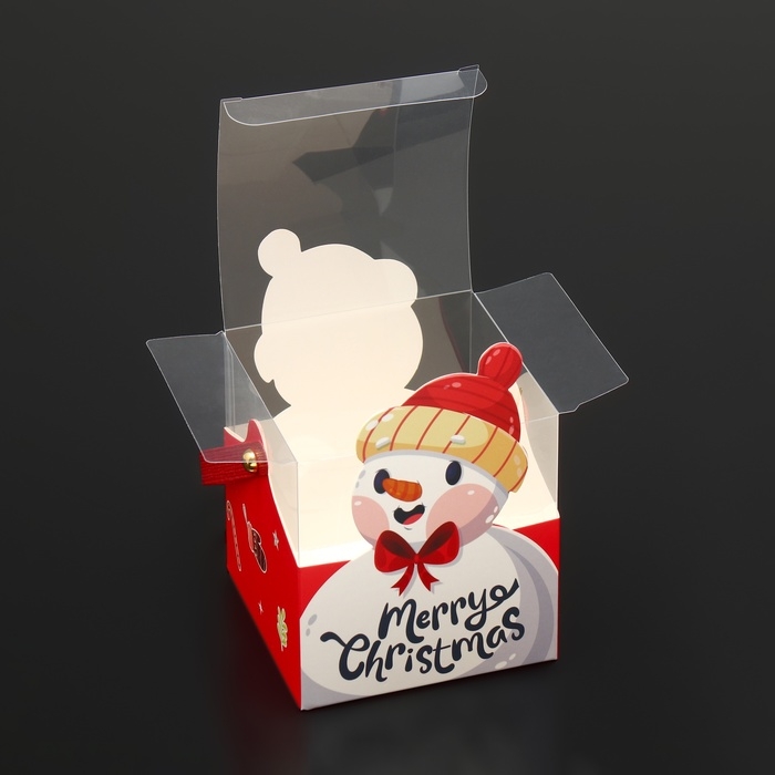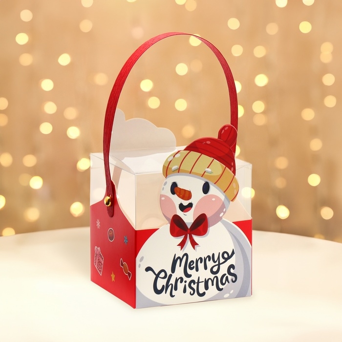 Новый год. Коробка подарочная новогодняя складная ПВХ с ручками, "Снеговик", 9 х 9 х 9,5 см.