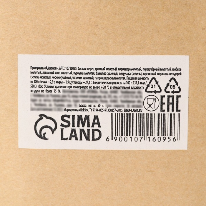Состав: перец красный молотый, кориандр молотый, перец чёрный молотый, имбирь молотый, лавровый лист молотый, куркума молотая, базилик сушёный, петрушка (зелень), горчичный порошок, сельдерей (зелень молотая), чеснок сушёный, базилик молотый, паприка красная молотая.