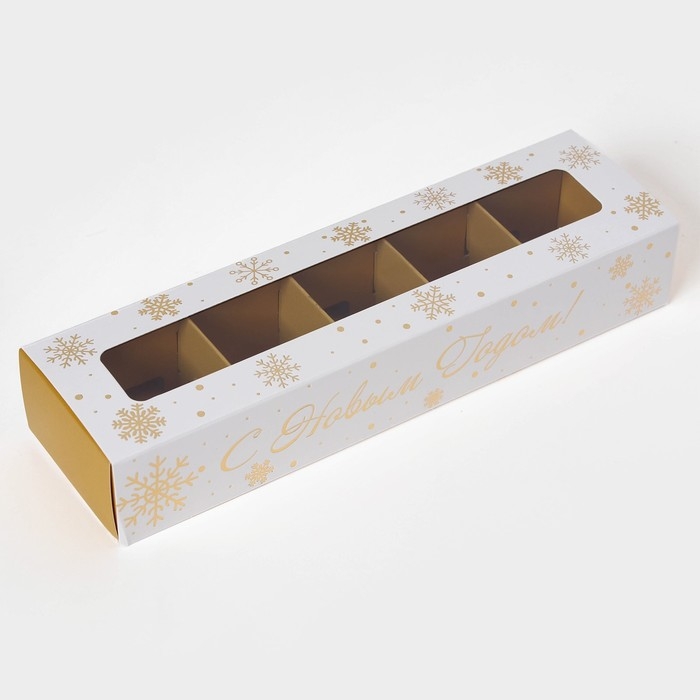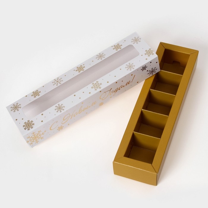 Коробка под 5 конфет 'Золотые снежинки', с обечайкой с окном, 21 х 5 х 3,3 см