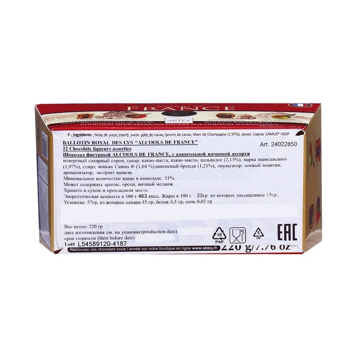 Новый год. Шоколад фигурный ALCOOLS DE FRANCE, с алкогольной начинкой, ассорти, 10 г