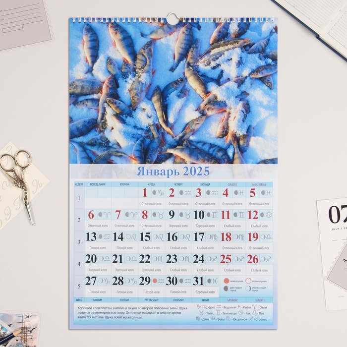 Календарь перекидной на ригеле А3 "Календарь рыболова" 2025, 32 х 48 см