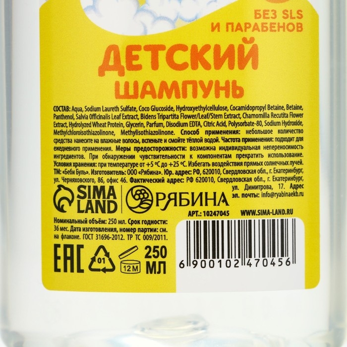 Детский шампунь для волос без слёз, 250 мл, с экстрактами ромашки и череды, 0+, БЕБИ БУЛЬ