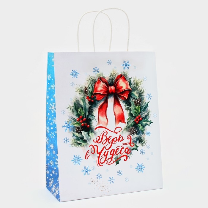 Новый год. Пакет бумажный подарочный новогодний крафт "Чудеса" 32 х 26 х 11 см.