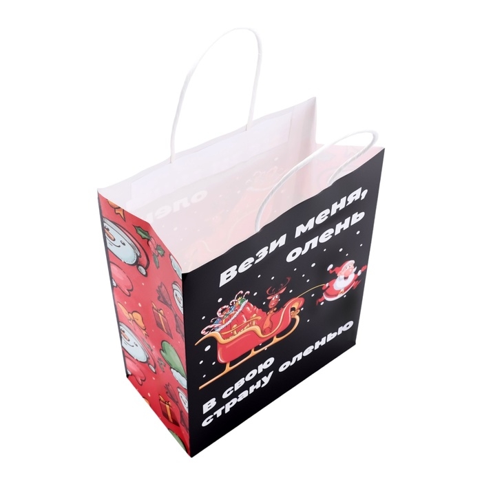 Новый год. Пакет бумажный подарочный новогодний крафт, "Вези меня" , 27 х 21 х 11 см.