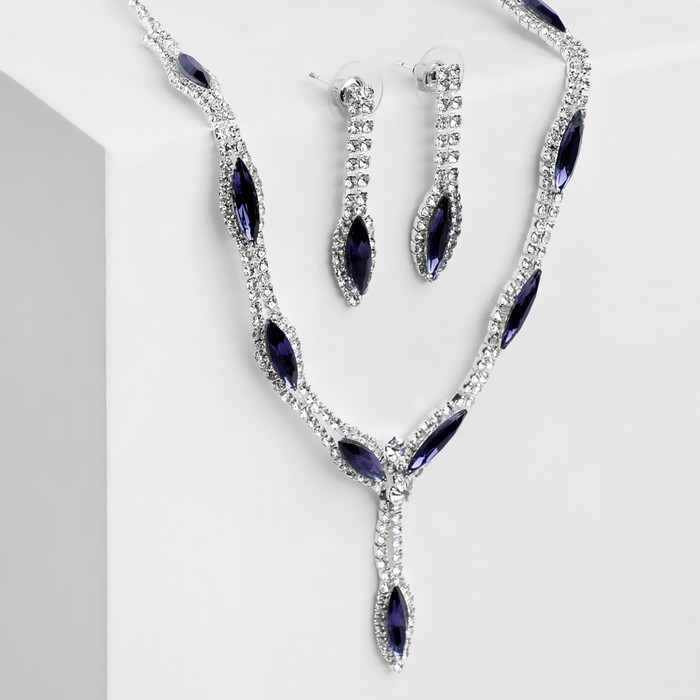 Набор 2 предмета: серьги, колье «Листопад» тонкий ромб, цвет сине-белый в серебре, 45 см