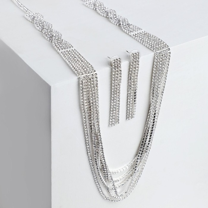 Набор 2 предмета: серьги, колье «Лёд» косичка, 80см, цвет белый в серебре, 80см