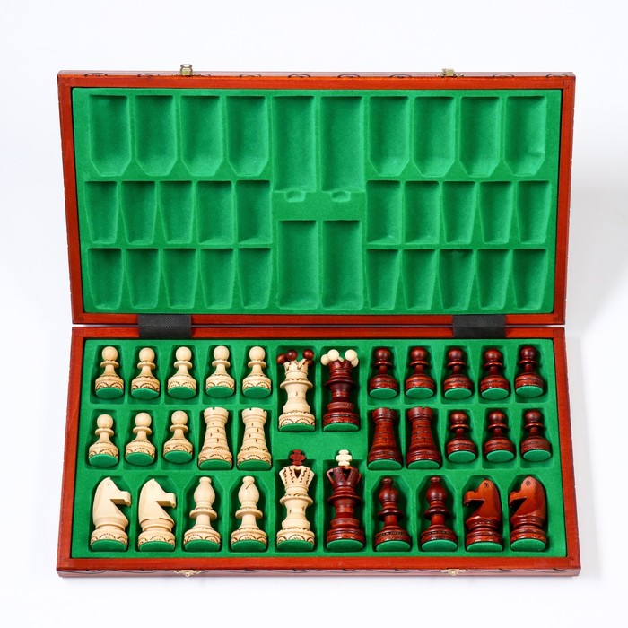 Наличие бархата зеленого цвета добавляет изыска изделию, а для удобного хранения шахматных фигур предусмотрены специальные отсеки, что обусловливает минимум передвижения при переноске.