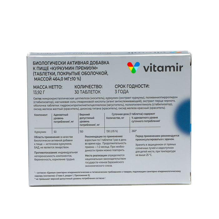 Состав: микрокристаллическая целлюлоза (носитель), куркумин, поливинилпирролидон (стабилизатор), магния стеарат (агент антислеживающий), экстракт перца черного, оболочка таблетки: гидроксипропилметилцеллюлоза (загуститель), полиэтиленгликоль (стабилизатор), оксид железа желтый (краситель), диоксид титана (краситель), оксид железа красный (краситель).