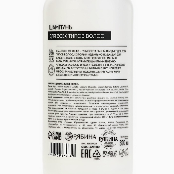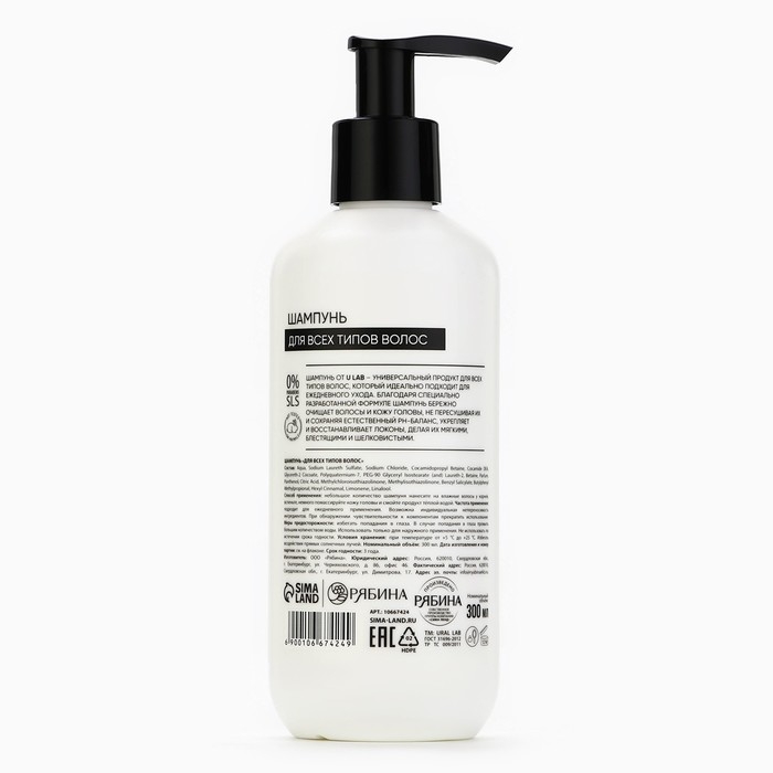 Шампунь для всех типов волос, 300 мл, аромат цветочный, U LAB