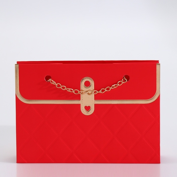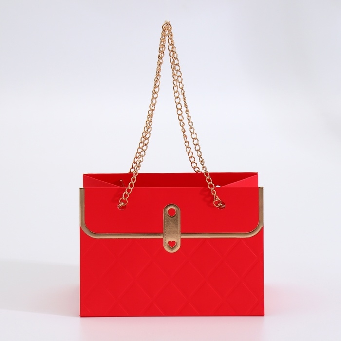 Главное украшение пакета — изящная цепочка, выполняющая функцию ручки. Она не только придаёт изделию элегантный вид, но и обеспечивает удобство при переноске. Золотое тиснение на поверхности добавляет пакету особого шика, создавая утончённый и праздничный акцент. Оно подчёркивает внимание к деталям и делает упаковку визуально привлекательной.