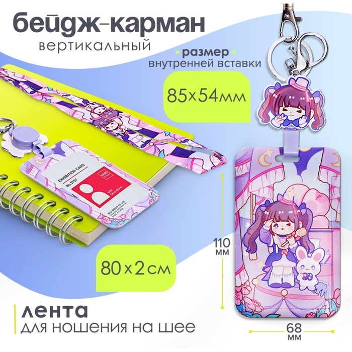 Бейдж-карман вертикальный внешний 110*68мм, внут 85*54мм, пластик, Аниме, лента 80*2см