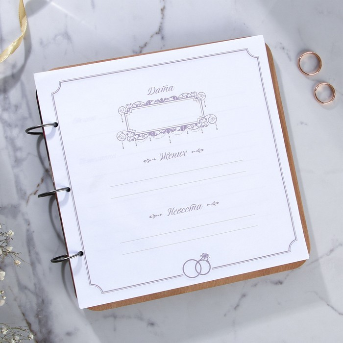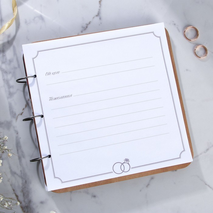 Гостевая книга с деревянной обложкой на кольцах. Записывать пожелания в эту книгу понравится всем гостям. А вам понравится то, что через много много лет вы сможете окунуться еще раз в атмосферу вашего праздника. Идеально для свадьбы в стиле бохо, рустик, минимализм, прованс. В книге 42 односторонних листа размером 21х21 см плотностью 80 гр., первый лист титульный, второй лист для молодоженов с указанием даты торжества и имён, последующие 40 листов для искренних пожеланий счастливой семейной жизни жениху и невесте.