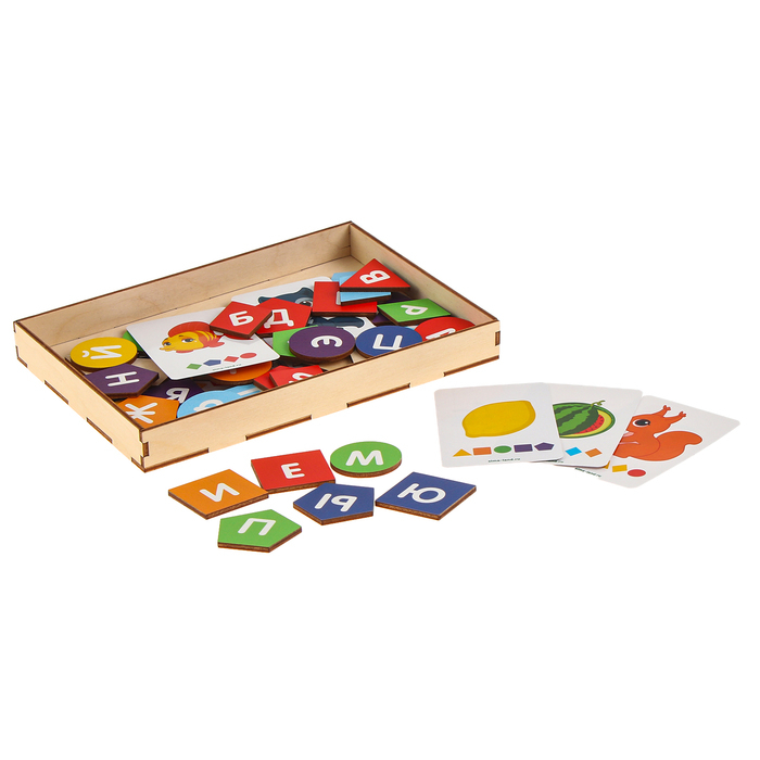 Играть очень просто: выберите карточку, попросите малыша подобрать нарисованные фишки, разложите их в том же порядке, что и на картинке, прочитайте слово.