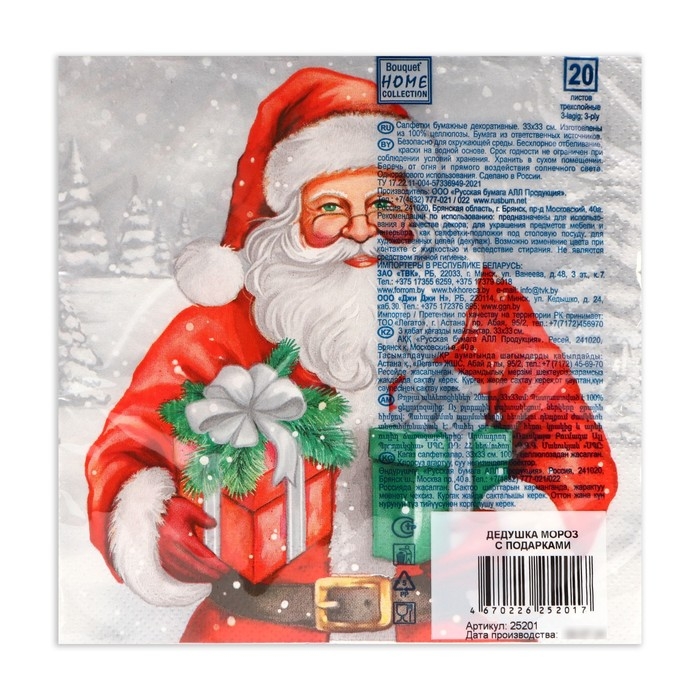 Новогодние салфетки бумажные Home Collection «Дедушка Мороз с подарками», 3 слоя, 33х33 см, 20 шт