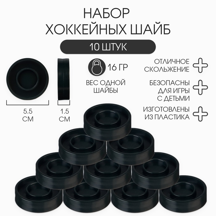 Набор детских шайб из пластика — это отличный выбор для юных спортсменов, которые только начинают свой путь в мире хоккея. В комплекте представлены 10 шайб, выполненных из прочного и безопасного пластика. Они идеально подходят для тренировок на улице и дома, а также для первых матчей и соревнований.