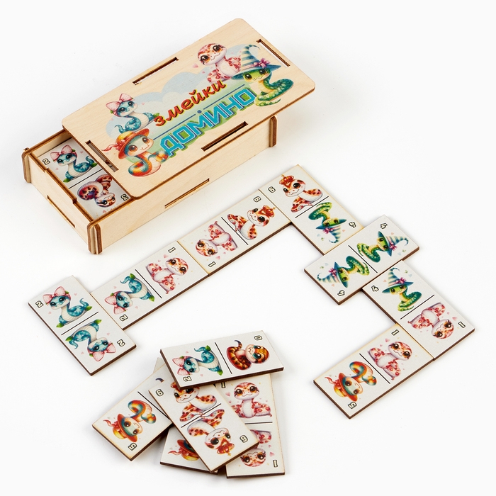 Домино деревянное детское "Цветные змейки", настольная игра, костяшка 6 х 3 см