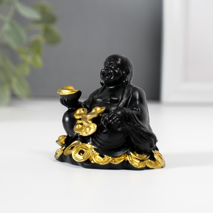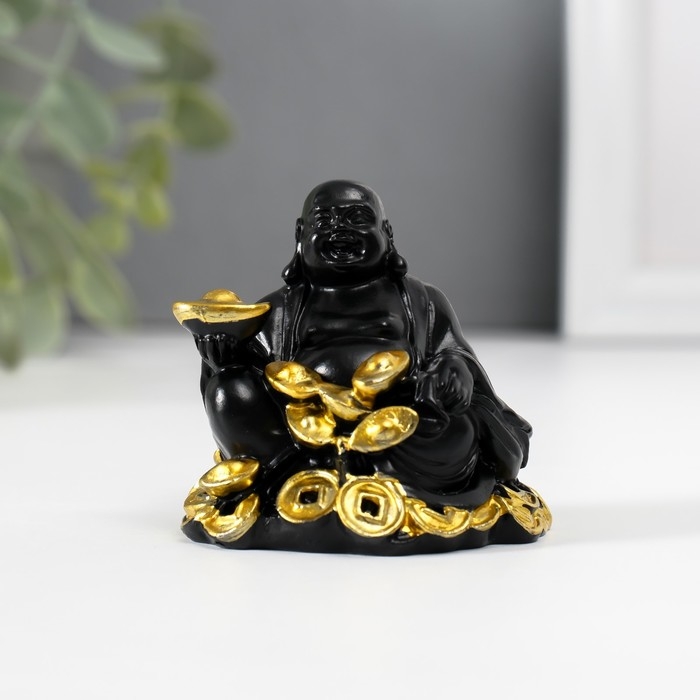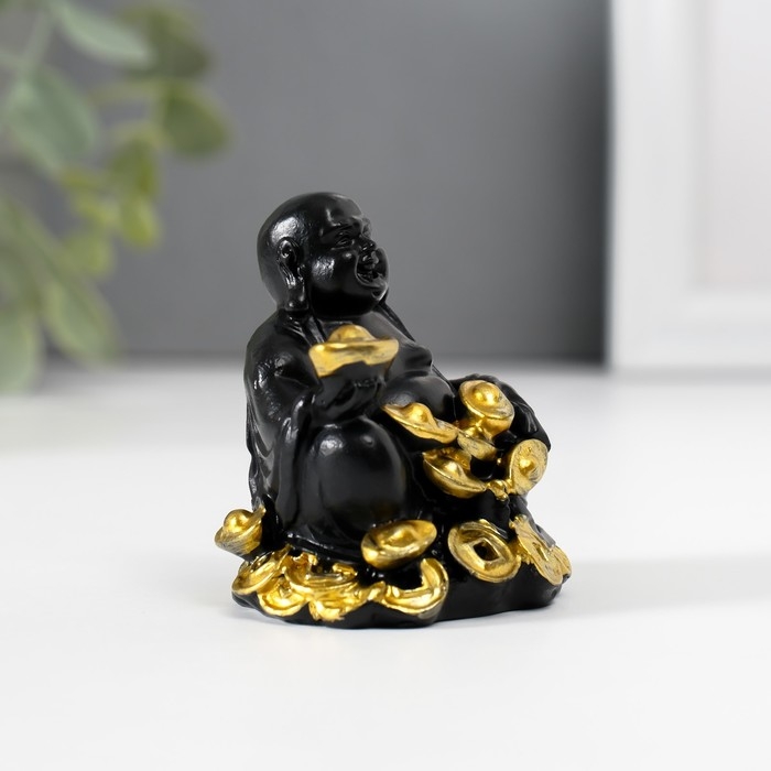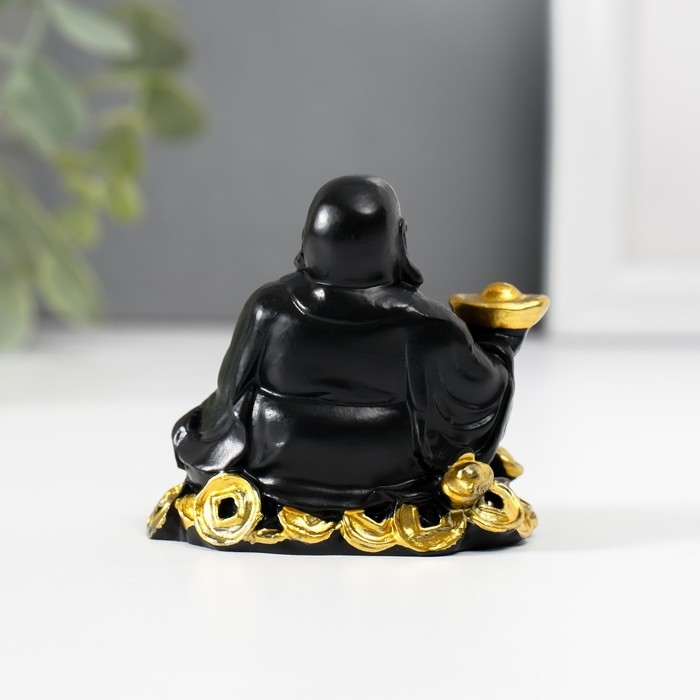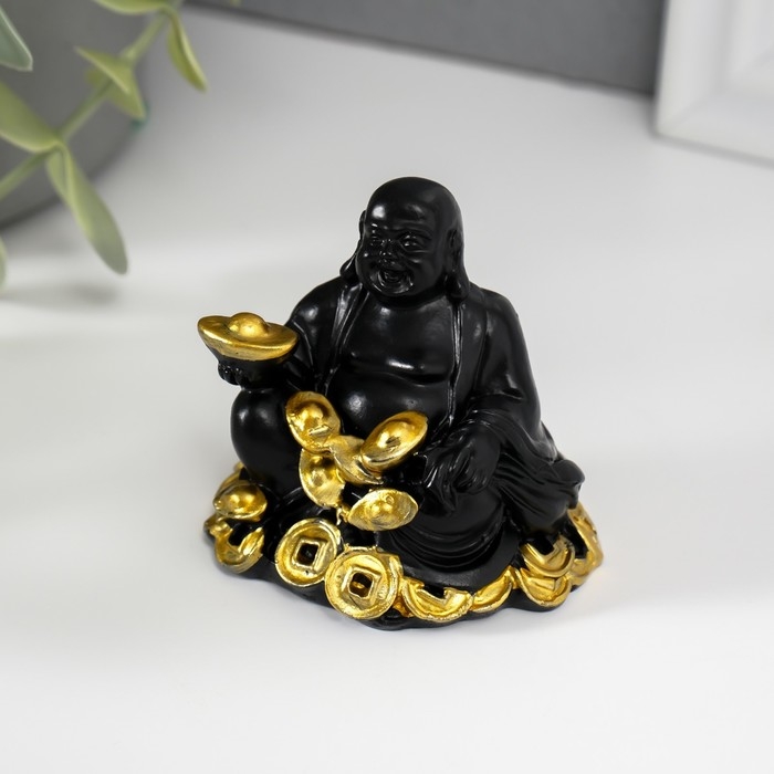 Нэцкэ полистоун "Хотей с золотыми слитками и монетами" чёрный 4х5,7х5,5 см