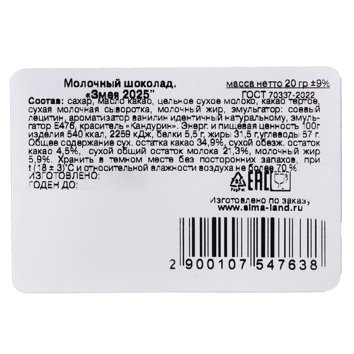 Новый год. Молочный шоколад "Змея 2025", 20 г