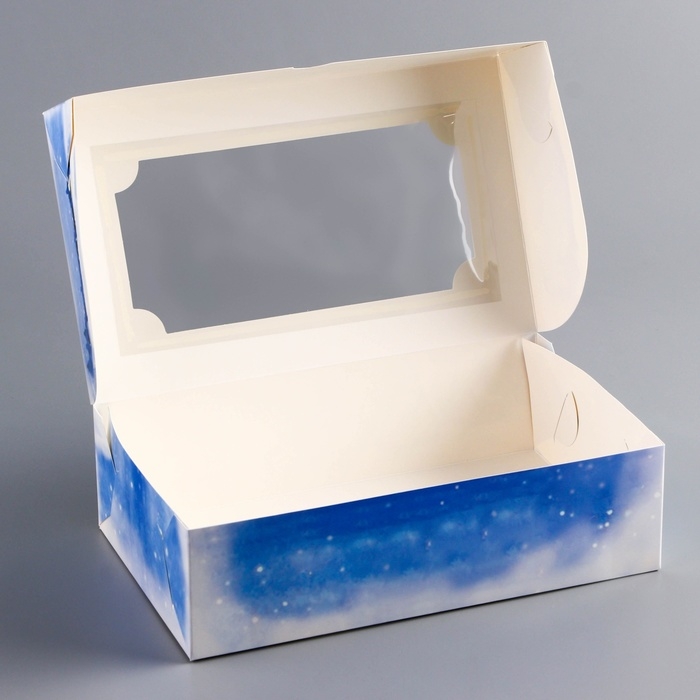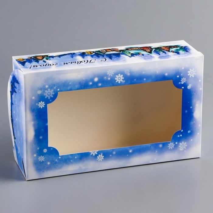 Новогодняя складная коробка с окном размером 25 х 15 х 7 см — это идеальная упаковка для праздничных подарков и угощений. Изготовленная из прочного картона, коробка украшена ярким зимним дизайном с новогодними мотивами, создавая атмосферу праздника.