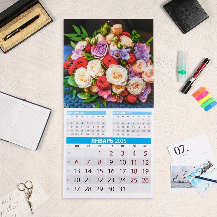 Календарь перекидной на скрепке "Нежные букеты" 2025 год, 12 листов, 29х29 см