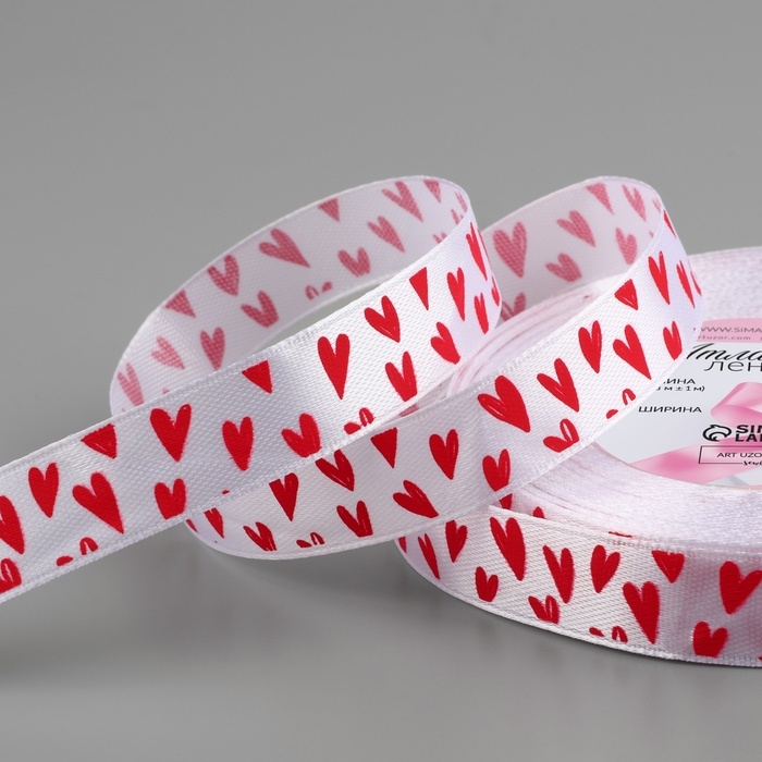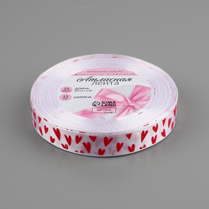 Лента атласная «Сердечки», 15 мм × 23 ± 1 м, цвет белый №01
