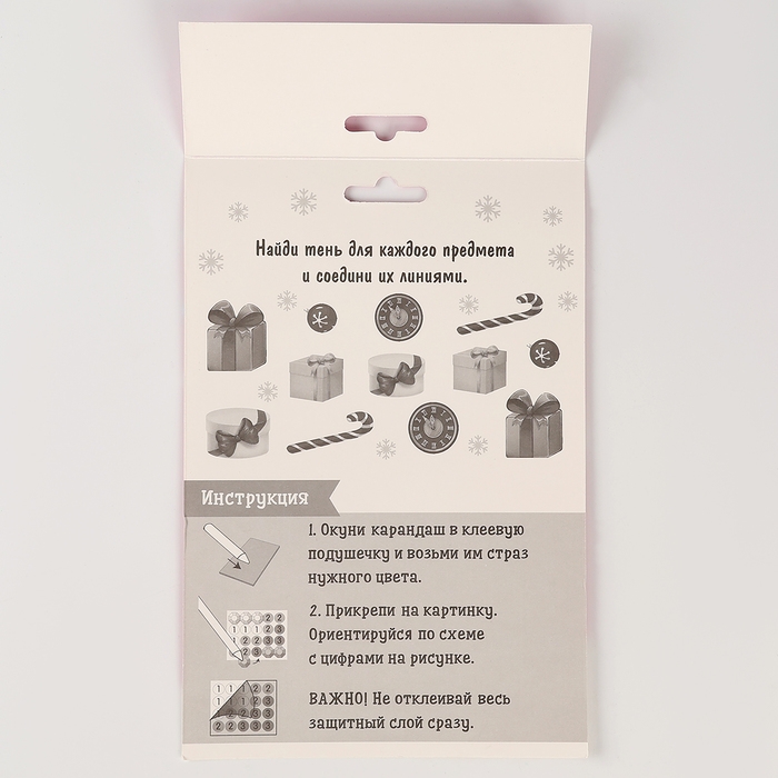 Ребёнку предстоит разложить карандашом кристаллики, постепенно заполняя рисунок элементами соответствующего цвета. Основа с клеевым покрытием будет надёжно удерживать стразы.