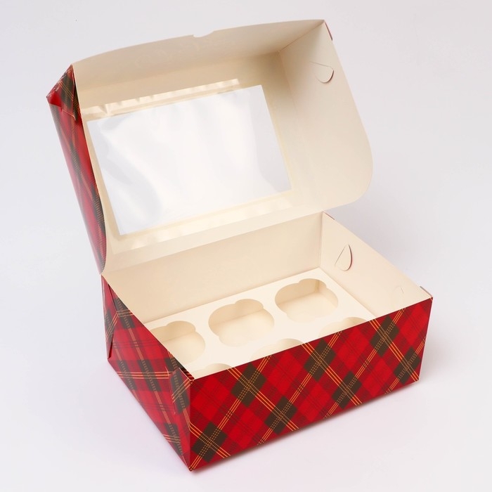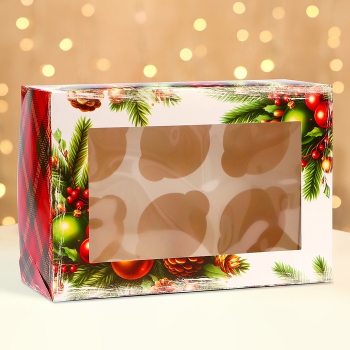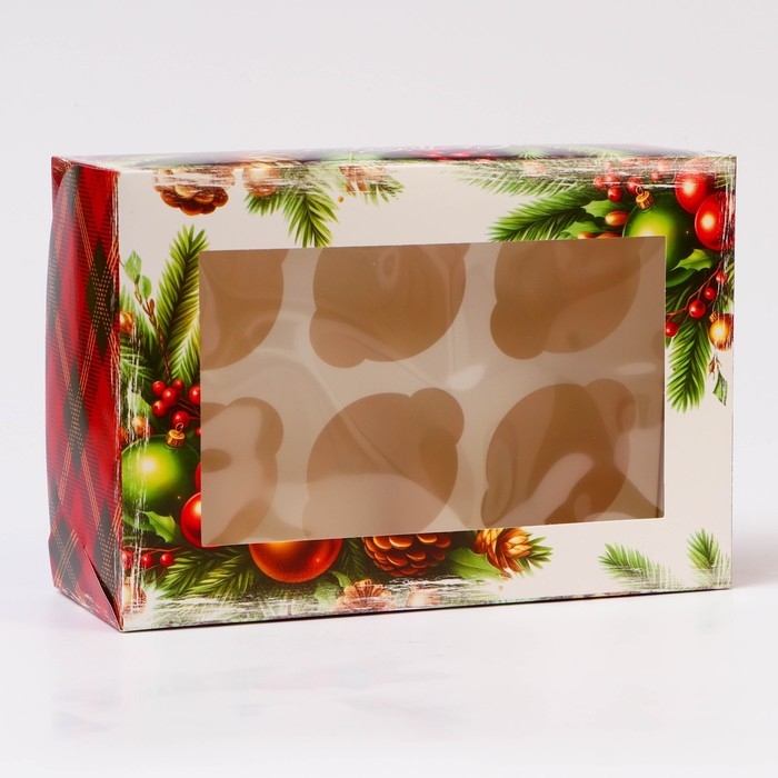 Новый год. Коробка для 6 капкейков с окном "Новогодняя с шишками", 25 х 17 х 10 см, упаковка