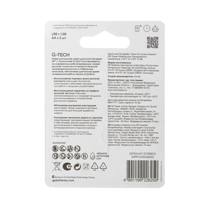 Батарейка алкалиновая GP Super, AA, LR6-2BL, 1.5В, блистер, 2 шт.
