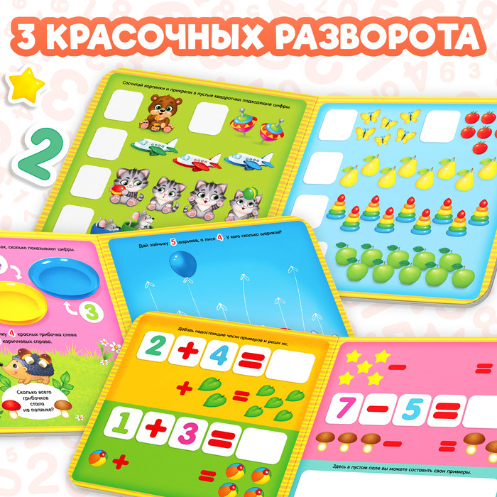 Внутри ребёнок найдёт интересные задания, которые нужно выполнять, используя магнитные цифры. Малыш будет составлять примеры и освоит счёт.