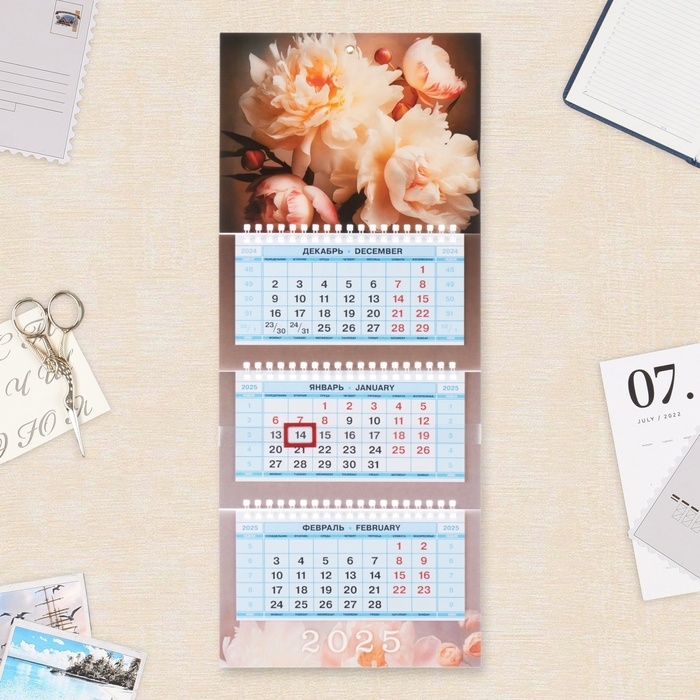 Календарь квартальный мини-трио "Нежные пионы" 2025 год, 19,5 х 47 см