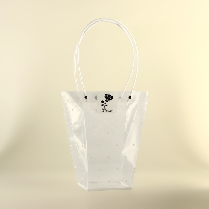Сумка размером 26х24х12 см отличается лёгкостью и удобством в использовании. Элегантные ручки обеспечивают комфортное перенесение, а прочные швы и устойчивое дно гарантируют надёжную фиксацию букета. Прозрачный материал позволяет цветам оставаться в центре внимания, подчёркивая их естественную красоту и свежесть.