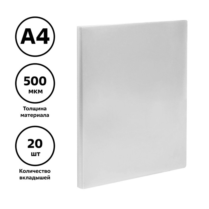 Папка с 20 вкладышами А4, 500 мкм, Calligrata, текстура "песок", белая. Папка с 20 вкладышами «Calligrata – отличный помощник для хранения бумаг формата А4. Изделие выполнено из качественного пластика с фактурой «песок», сохраняющим внешний вид изделия от загрязнений и повреждений. Размер изделия составляет 310 х 235 мм. Ширина корешка – 14 мм. Тип скрепления – термосварка. Бумагам, вложенным в папку, не требуется перфорация дыроколом. Папка упакована в индивидуальный пакет. Товар подходит для персонализации.