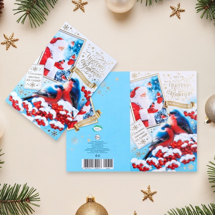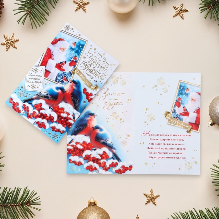 Открытка-евро "С Новым Годом!" конгрев, тиснение, снегири, 11 х 21,5 см