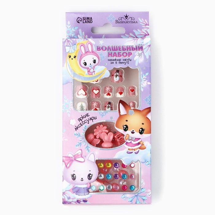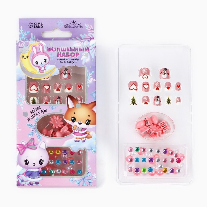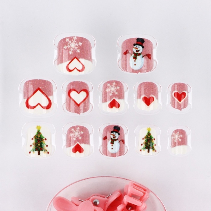 Детские накладные ногти на новый год «Новогоднее настроение», 12 шт, подарочный набор с браслетом и заколками