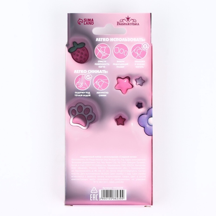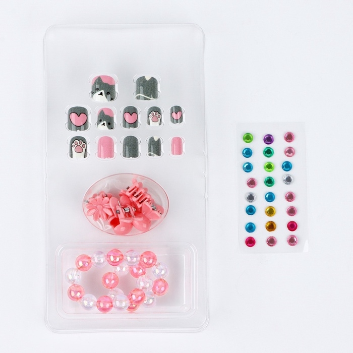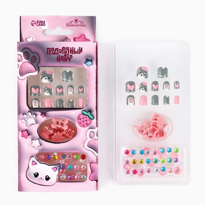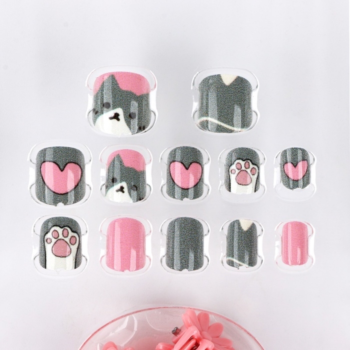 Детские накладные ногти «Сладкий котик», 12 шт, набор с браслетом и заколками
