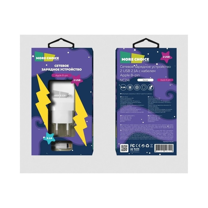 Сетевое зарядное устройство More choice NC24i, 2.1А, кабель lightning, белый