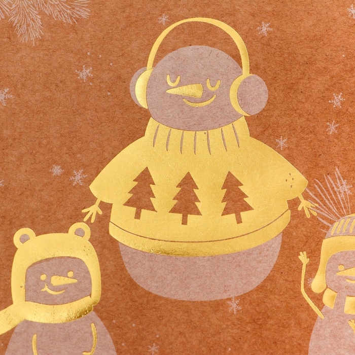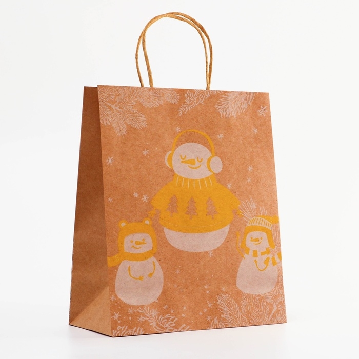 Пакет крафт с золотым тиснением, "Снеговик" круглая ручка, 33 х 25 х 12 см, 120 г