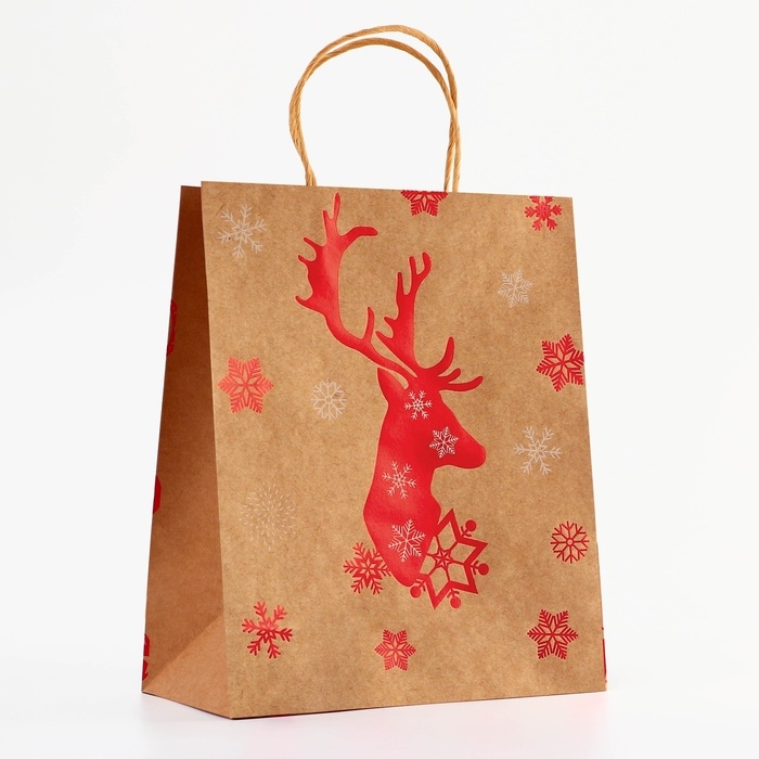 Пакет крафт с тиснением, круглая ручка, "Олень" 33 х 25 х 12 см, 120 г