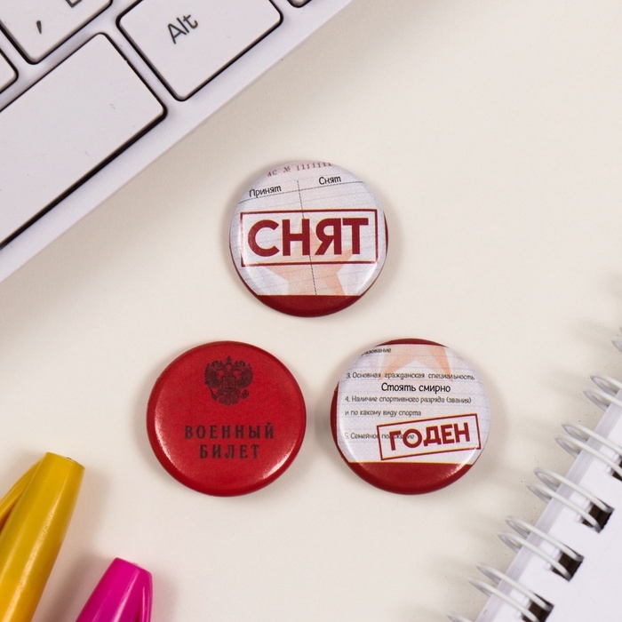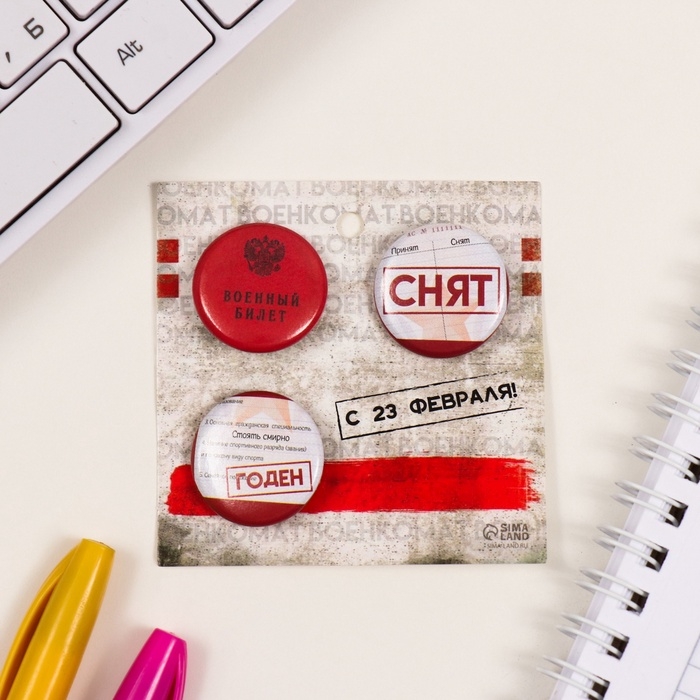 Значки закатные набор 3 шт d=25 мм "Военный билет" 7х7 см