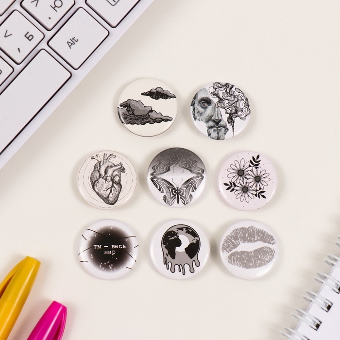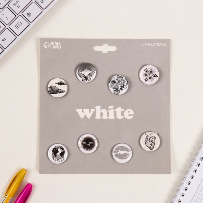 Значки закатные набор 8 шт d=25 мм "Белые" 16,5х17 см
