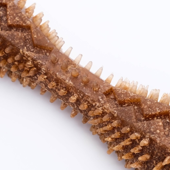Массажный эффект: Одна из главных особенностей игрушки – это текстурированная поверхность, которая при жевании обеспечивает мягкий массаж десен и зубов вашего питомца. Это помогает поддерживать здоровье полости рта, снижая риск возникновения налета и заболеваний десен.